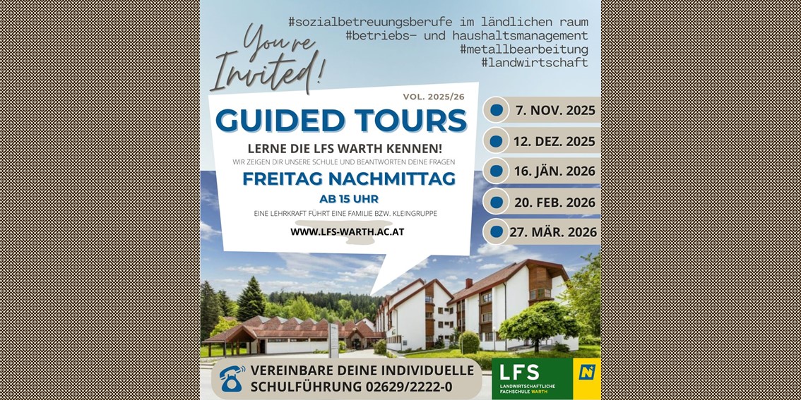 “Mehr Erfolg im Kuhstall” Mittwoch, 26. November 2025 Veranstaltungsort: LFS Warth, Aichhof 1, 2831 Warth Die Landwirtschaftskammer Niederösterreich organisiert an der LFS Warth eine Vortragsveranstaltung unter dem Titel “Mehr Erfolg im Kuhstall”. Diese Vorträge werden mit Schwerpunktthemen zur Milchviehhaltung und Lebensqualität gemeinsam von LK, LFI NÖ, NÖ Genetik Rinderzuchtverband und den landwirtschaftlichen Fachschulen in NÖ […]